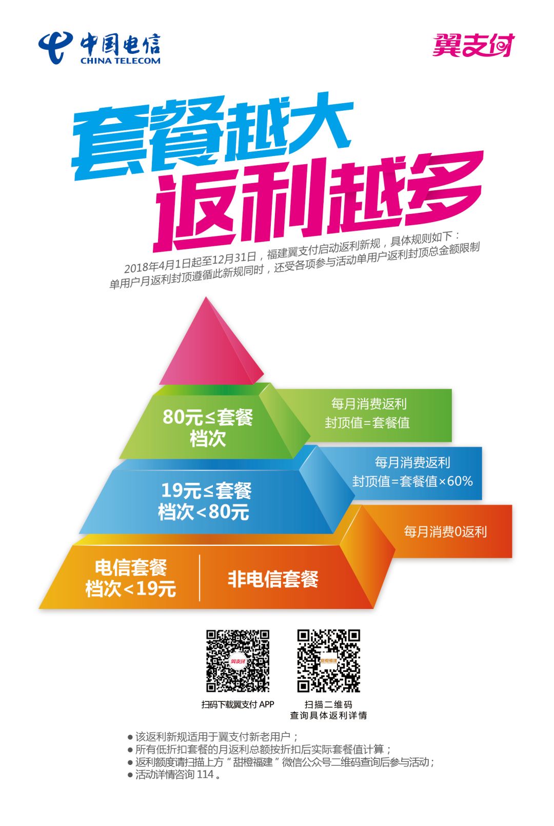 4月1日起,翼支付优惠活动全面升级,参与活动将受电信套餐限制,变更如下:
