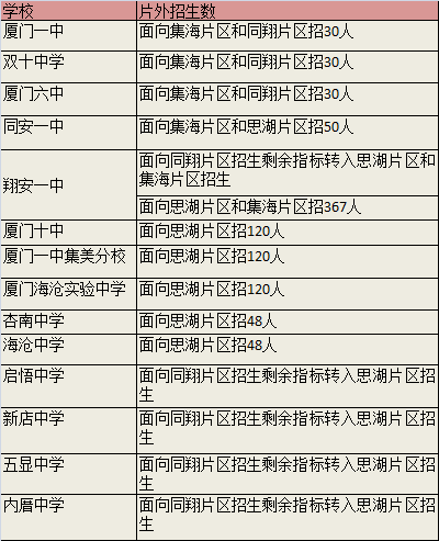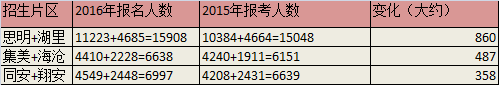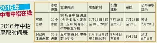 下面这些重要信息你可能需要! 招生人数和招生计划是怎样的? 简单来说,今年中考的录取率也是100%,即只要是在厦门参加中考,都会有书读。 那么今年有多少考生呢?今年报名参加中考报名人数为29543人,比去年多了1705人。 关于各个片区的招生人数,小伙伴们看下表(点击看大图): 备注:(1)11223+4685指的是,思明报名人数是11223,湖里是4685名,下同。 这张表大家看懂了吗?大多数普高学校是在各自招生片区录取,全市有三大招生片区——思明湖里(简称“思湖”),集美海沧(简称“集海”),同安翔安(同翔)。这张表作用:你所在片区有多少考生和你竞争。 今年多少人能上普高? 去年中招的普职比为:55:45,即平均每100名被录取的高中生中,55人上普高。市教育局曾表示,今年将维持大致比例。 能否上普高到底要看片区位次还是什么? 片区的位次只在此发生作用。录取时,还是看全市位次。 2016年各招生片区各类普高招生情况,小伙伴们请看下表(点击看大图): 学校类别 招生类别 总人数 招生片区 面向全市 思明湖里 集美海沧 同安翔安 普通生(含定向生) 普通生 14347+140+启悟、新店、内厝、五显的余额投放到思湖 1940 6175+启悟、新店、内厝、五显的余额 2540 3692 定向生 1482 953 210 319 备注: (1)表格中的招生数为扣除台生班、保送生,但是,包括学校的特长生。 (2)“140”为厦门一中、双十、厦门六中面向其它片区招收各30人,同安一中招收50人。 平行志愿是什么意思? 中招实行平行志愿,指的是市招办投给学校的投档方式,实质是分数优先,分数是“老大”。 平行志愿是这样将考生的档案投到学校:先将考生的投档分(中考文考分+照顾分)从高到低排列,从投档分第一高的考生开始录取。打个比方,如果小强在片区的排名是600名,好比一个苹果,他填报的30个志愿好比30个筐子,市招办先把小强扔到1筐里(他的第一志愿学校),如果1筐里的苹果已经装满了(说明他够不上学校的分数),再把他扔到2筐,如果2筐也满了,就再扔到3筐里,直到他填报所有学校都投完,如果还是不行,说明小强的分数达不到他填报的所有学校。 换句话说,只要小强分数够得上某校的分数线,不会因为你把某校填报在第二甚至更后的志愿而不录取你,也不会出现这种情况:假如某校只剩一个志愿,小强的分数比小明高,小强把某校填在第二,小明把它填报在第一,就先录取小明,你没有被录取,只能说你的分数不够,这就是“平行志愿”中“分数是老大”含义。 A只要是同一批次,平行志愿的志愿之间是没有顺序的? 答:错。从1到30,是依次搜索的——如果你将S校填在1,T校填报在2,又都符合两校招生条件,则你会先被S校录取,不会再被T校录取。 B平行志愿就是平行录取? 答:有人认为,既然是平行志愿,那么,如果我符合从1到30所有志愿学校的分数,那么,都会被录取,然后由考生挑选。事实上,如果考生的分够得上第一志愿学校,马上投入到1,不会再被2和以后的志愿录取。 定向生是怎么一回事? 四所学校招收定向生,总计1482,去年是1418名。 关于2016年四所省一级达标学校定向生计划/招生片区小伙伴们可以看下表(点击看大图): (1)定向生指的是部分省一级达标学校将一部分普通生招生计划(今年50% ),直接分配到区域内学校,例如,厦门一中的普通生指标是分配给思明和湖里的,它的定向生则分到各所学校。也就是说,对于考生来说,定向生竞争的范围局限在自己就读中学,此外,要求填报定向生前,一定要填报普通生,目的就是为了让一部分高分的考生先被普通生录取。因此,同一所学校的定向生的分数会低于普通生。 (2)报考定向生的考生:初中阶段均在学籍学校就读的我市学校的应届考生(借读生不能报考),符合报考普高条件的外来娃也可报考。 (3)今年定向生最低录取线不得低于普通生40分,如厦门一中普通生录取线是550分,那么,定向生最低分就不得超过510分,但是,并不是说所有符合报考条件、510分以上的考生都能被录取,只能从550分开始降,如果降3分就完成招生计划,就不会再往下降。 (4)定向生的录取是由市招办从高到低分完成录取,不存在学校暗箱操作。 这几天家长一直要求学校公布排名,其实是没有多大意义,只是求个心安,但是,你还是不会知道排在你前面的人要报一中定向还是双十定向,更关键的是,在平行志愿中,不会你把哪所填报在后面,而不录取你! 更重要的是,亲!现在把时间花在孩子要选择什么学校最合适,不要再花那么多精力去揣测学校会怎么暗箱操作。定向生不是在学校录取,真的没有那么阴谋论!如果实在不放心,到时可取审查查。 (5)各校获得的指标是按比例分的,以思明和湖里片区为例,以这个片区定向生指标为分子,这个区符合定向生条件的考生人数为分母,得出一个比例,每所学校符合定向生的人数乘以这个比例,就是这所学校定向生招生人数,换句话说,学校符合条件的考生越多,获得的名额就多。 所以,亲,这里也没有什么阴谋论,不要去纠结为什么他们学校的定向生比我孩子学校的多。 普高录取分数线什么时候公布? 普高录取分数线预计7月24日晚公布。具体见下表(点击看大图): 今年新增职业类征求志愿,市招办提醒: 一,征求志愿填报的对象是常规志愿投档录取仍无去向的考生; 二,招生学校仅限于常规志愿录取未完成有剩余计划的职业类学校(含高职、中专)。 职业类学校征求志愿填报时间:8月2日8时至8月3日20时止。 填报